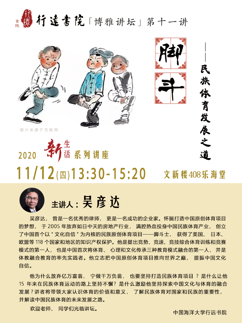 讲座题目:脚斗—民族体育发展之道讲座时间:2020年11月12日(周四)13:30-15:20讲座地点:崂山校区文新楼乐海堂(408)主讲人:吴彦达主讲人简介:吴彦达,曾是一名优秀的律师,更是一名成功的企业家。怀揣打造中国原创体育项目的梦想,于2005年放弃如日中天的房地产行业,满腔热血投身中国民族体育产业,创立了中国首个以“文化自信”为内核的民族原创体育项目——脚斗士,获得了美国、日本、欧盟等118个国家和地区的知识产权保护。他是提出竞势、竞速、竞技综合体育训练和竞赛模式的第一人,也是中国首次将体育、心理和文化传承三种教育模式融合的第一人,并是体教融合教育的率先实践者。他立志把中国原创体育项目推向世界之巅,提振中国文化自信。讲座提纲:他为什么放弃亿万富翁,宁做千万负翁,也要坚持打造民族体育项目?是什么让他15年来在民族体育运动的路上坚持不懈?是什么激励他坚持探索中国文化与体育的融合发展?讲者将带领大家认识体育的价值和意义,了解民族体育对国家和民族的重要性,并解读中国民族体育的未来发展之路。